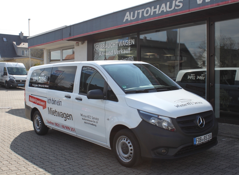 Bei uns können Sie einen Mercedes Vito 8-Sitzer mieten. Perfekt für komfortable Ausflüge, Urlaubsfahrten oder den Transport von Gruppen. Ausstattung: Klimaanlage, Navigationssystem, Anhängerkupplung und vieles mehr.